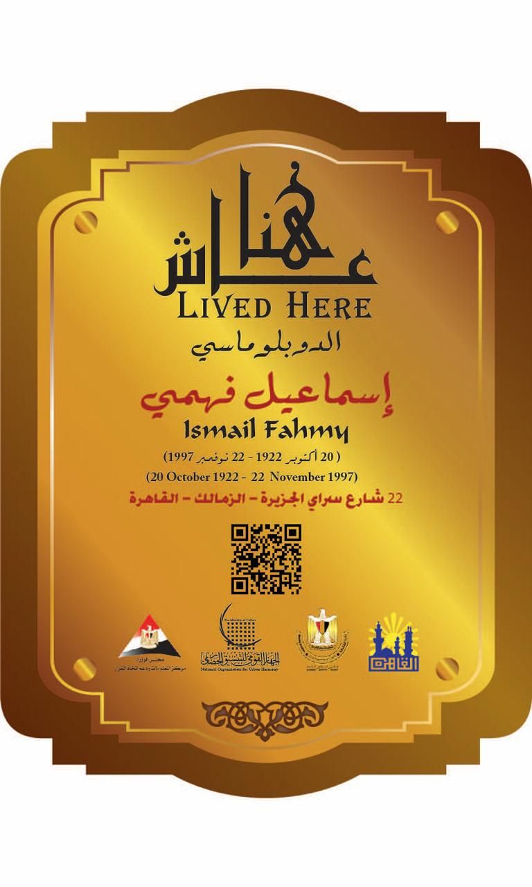 ضمن مشروع عاش هنا الذي ينفذه الجهاز القومي للتنسيق الحضاري، تم وضع لافتة تحمل اسم الدبلوماسي إسماعيل فهمي على باب منزله في شاري سراي الجزيرة بالزمالك، تخليدا لمسيرته وإسهاماته.