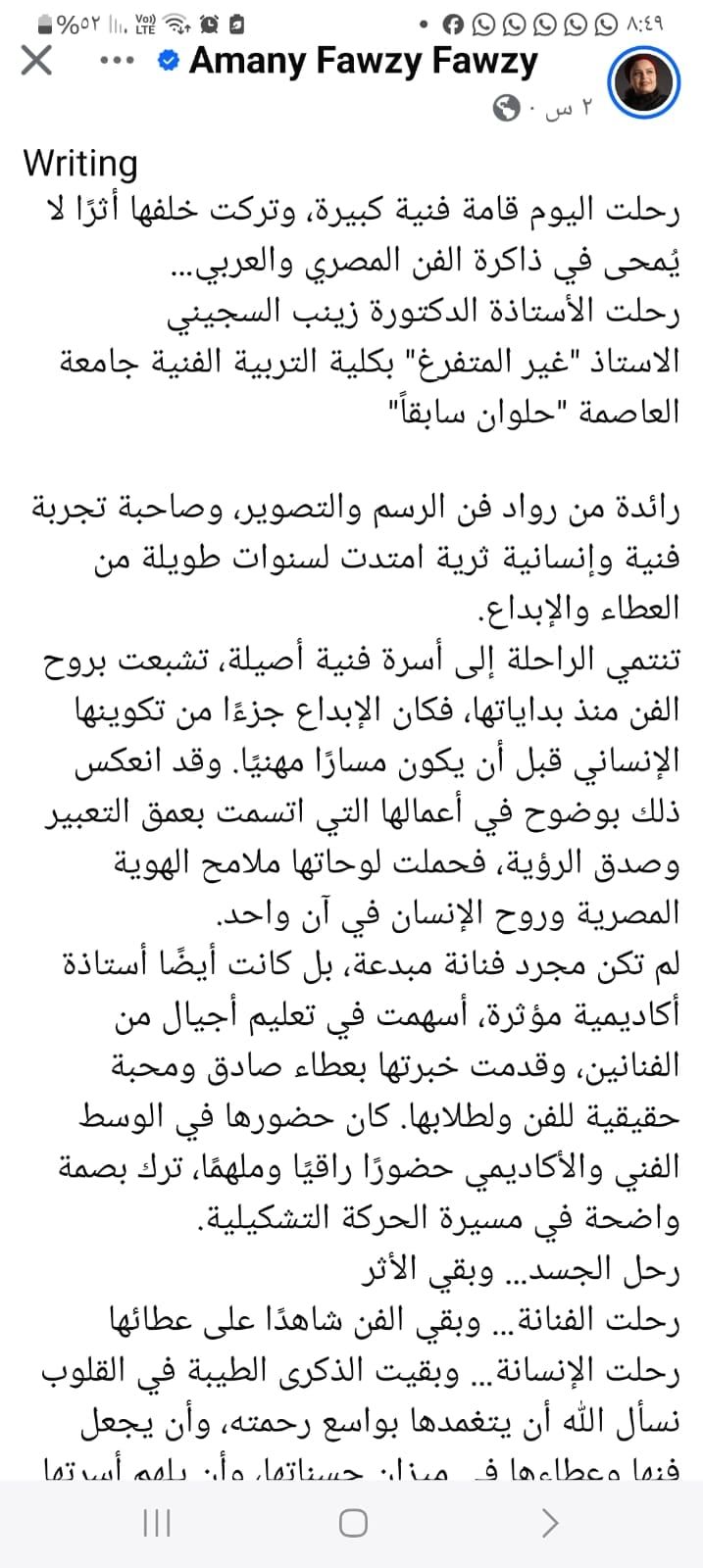 ونعت الفنانة التشكيلية أماني فوزي الراحلة عبر صفحتها الرسمية على فيس بوك ، مشيدةً بمكانتها الكبيرة في الوسطين الفني والأكاديمي، وبما قدمته من إسهامات مؤثرة في تعليم أجيال من الفنانين.