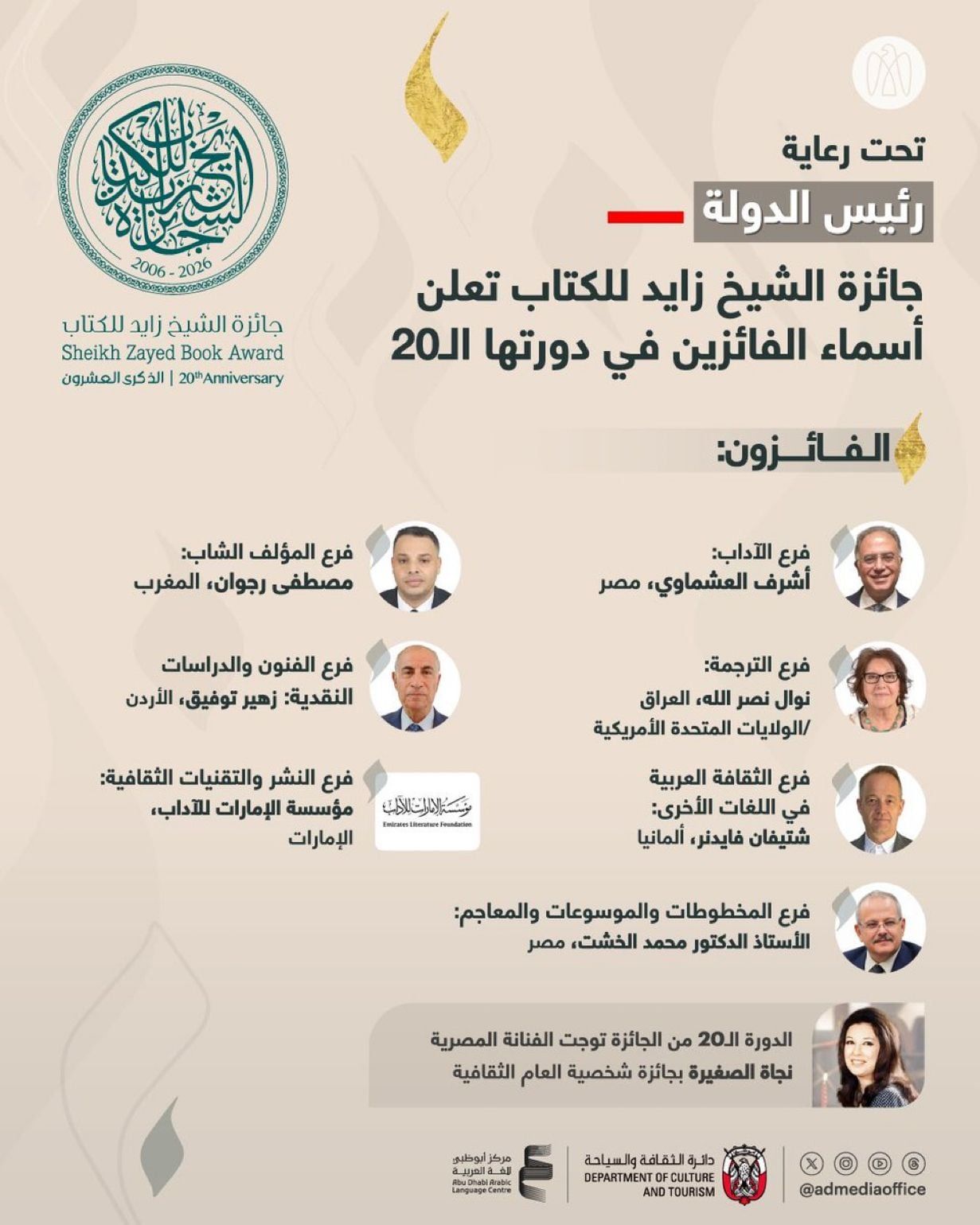 أعلنت جائزة الشيخ زايد للكتاب، أسماء الفائزين في دورتها العشرين، والتي شهدت تتويج نخبة من المبدعين والباحثين من مختلف الدول العربية والعالم.