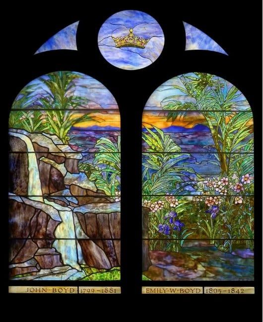 تم تصميم هذه النافذة، التي تعلوها ميدالية مرصعة بتاج من الجواهر المصقولة يدويًا، بتكليف من إيلين رايت بويد تخليدًا لذكرى والديها، جون وإيميلي بويد ، وتم تركيبها عام 1899، جون بويد، وزير خارجية ولاية كونيتيكت سابقًا، جمع ثروته من صناعة الصلب، ويُعرف محليًا بكتاباته عن تاريخ المستوطنين الأوائل في المنطقة، وفقا لما نشره موقع" news.artnet".