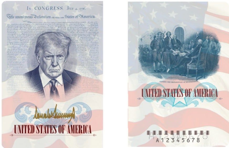 جواز سفر أمريكى يجمع بين وجه ترامب ولوحة ترمبل