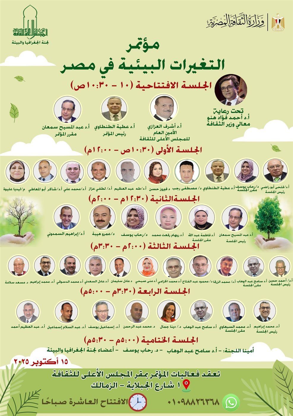 ينظم المجلس الأعلى للثقافة، بالتعاون مع كلية الدراسات الإفريقية بجامعة القاهرة، الأربعاء الموافق 15 أكتوبر 2025، مؤتمرًا علميًا موسعًا بعنوان "التغيرات البيئية في مصر"، بمقر المجلس الأعلى للثقافة بدار الأوبرا المصرية، بمشاركة نخبة من الباحثين والمتخصصين في مجالات البيئة والمناخ؛ يأتي ذلك تحت رعاية الدكتور أحمد فؤاد هنو وزير الثقافة.