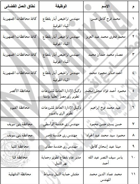 ونصت المادة الأولى: يخول العاملون بوزارة الموارد المائية والري - الآتية أسماؤهم بعد، بصفاتهم الوظيفية - كل في دائرة اختصاصه - صفة مأموري الضبط القضائي، وذلك إعمالا لنص المادة (۲۳) من قانون الإجراءات الجنائية، بالنسبة للجرائم التي تقع بالمخالفة الأحكام القانون رقم ٤٨ لسنة ۱۹۸۲ في شأن حماية نهر النيل والمجاري المائية من التلوث والقانون رقم ١٤٧ لسنة ۲۰۲۱ بإصدار قانون الموارد المائية والري، وهم:-