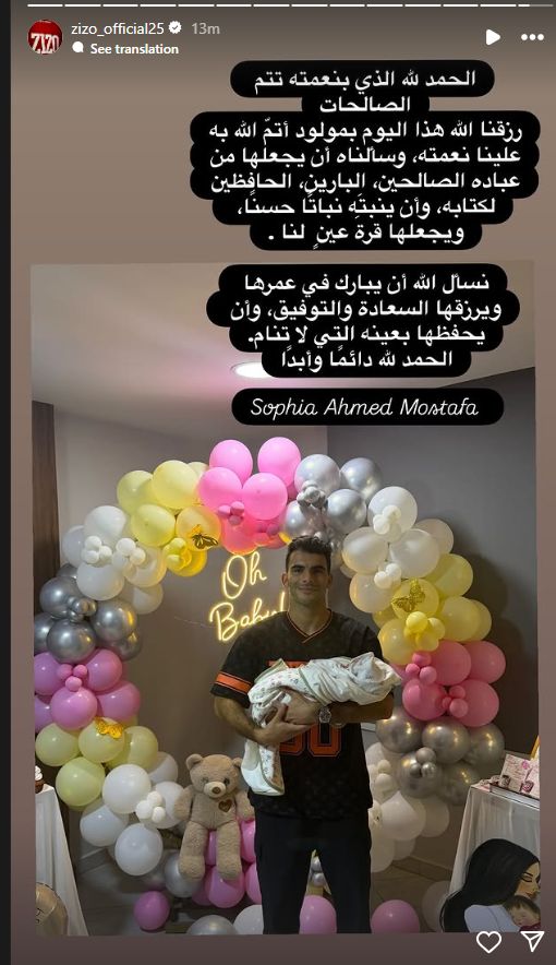تحيا مصر، وكتب زيزو عبر حسابه الرسمي"انستجرام": الحمدلله الذي بنعمته تتم الصالحات، رزقنا الله هذا اليوم بمولود أتم الله به علينا نعمته، وسألناه أن يجعلها عبادة الصالحين، البارين، الحافظين لكتابه، وأن ينبته نباتاً حسنا، ويجعلها قرة عين لنا".