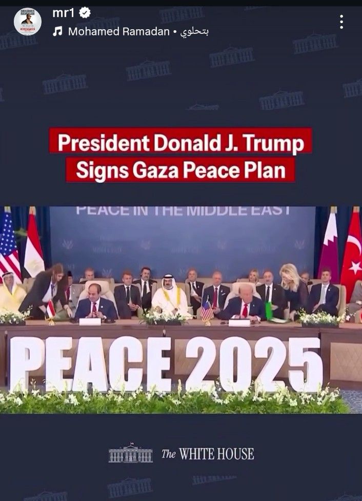 وشارك محمد رمضان جمهوره هذه المشاعر عبر منشور مؤثر على حسابه الرسمي بموقع إنستجرام، حيث كتب قائلاً وفقًا لما رصده موقع تحيا مصر: “أشعر بفخرٍ عميقٍ وتأثرٍ كبيرٍ وأنا أشهد هذه اللحظة التاريخية، لحظةً تضمن السلامَ والأمانَ الدائمين لجيلنا ولأجيال أبنائنا القادمة، توقيع معاهدة إنهاء الحروب في المنطقة العربية بقيادة الرئيس دونالد ترامب والرئيس عبد الفتاح السيسي وقادة العالم العربي هو اتفاقية العصر الذهبي للشرق الأوسط"، والمنشور الذي شاركه محمد رمضان حظي بتفاعل واسع من متابعيه الذين شاركوه مشاعر الفخر والتفاؤل، معتبرين أن صوت الفنان في مثل هذه اللحظات التاريخية يعبّر عن وعي فني وشعبي بأهمية السلام كقيمة إنسانية عليا تتجاوز السياسة والفن.
