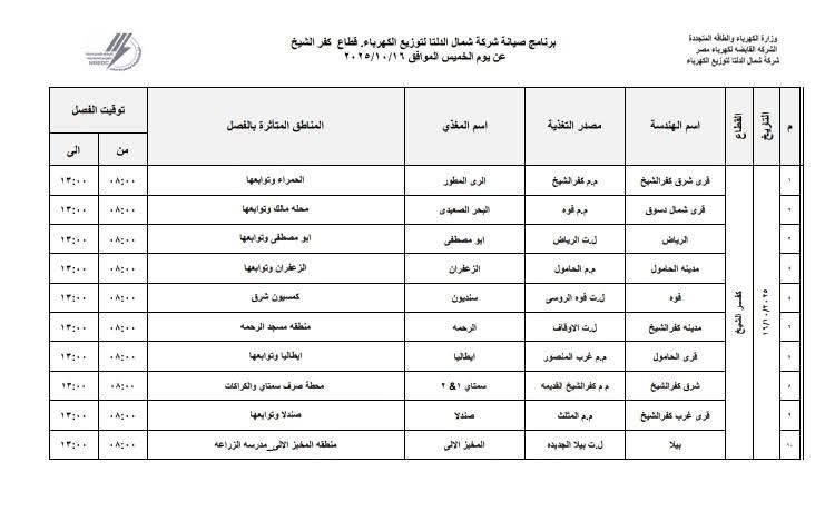 أعلنت شركة شمال الدلتا لتوزيع الكهرباء – التابعة لوزارة الكهرباء والطاقة المتجددة – عن تنفيذ برنامج صيانة دورية غدًا الخميس الموافق 16 أكتوبر 2025، بقطاع كهرباء كفر الشيخ، وذلك في إطار خطتها الدورية لرفع كفاءة الشبكة وتحسين جودة التغذية الكهربائية والخدمة المقدمة للمواطنين.