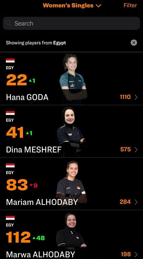 أما على صعيد السيدات، فقد واصلت النجمة المصرية هنا جودة تألقها العالمي وحافظت على صدارتها عربياً وإفريقياً بعدما جاءت في المركز الثاني والعشرين عالميًا برصيد 1110 نقاط، لتؤكد مكانتها كواحدة من أبرز لاعبات اللعبة على مستوى العالم.