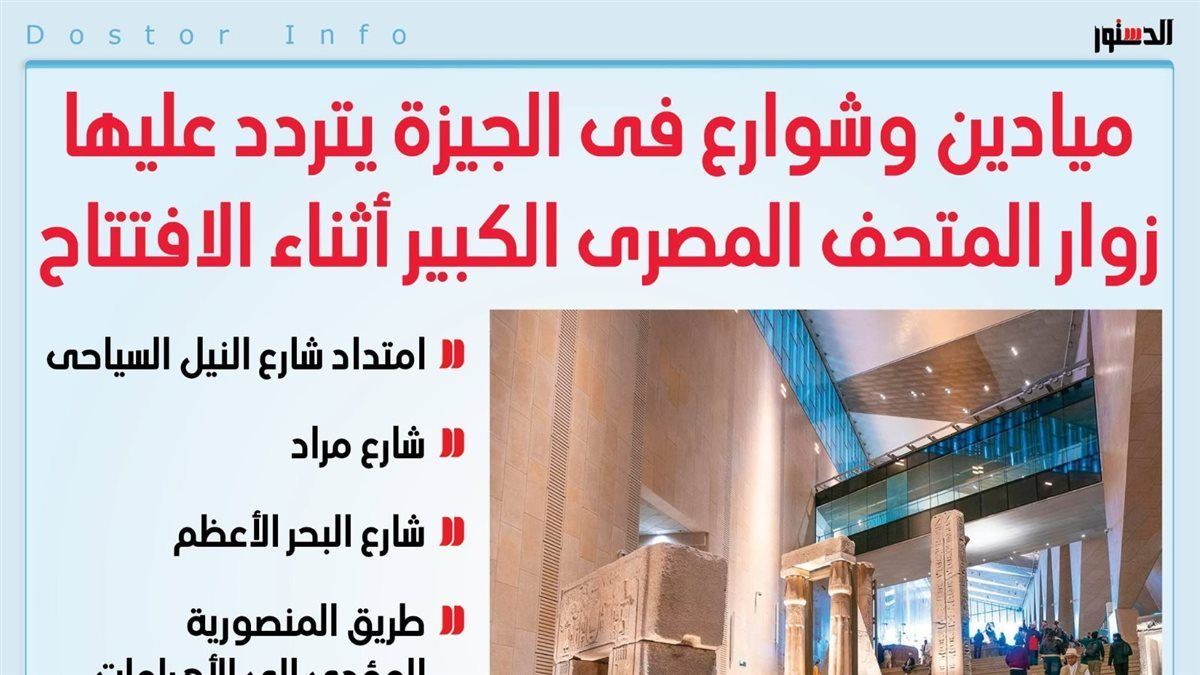 يستعرض الدستور عبر الإنفوجراف التالي، ميادين وشوارع سيتردد عليها زوار المتحف المصري الكبير لحضور الافتتاح.