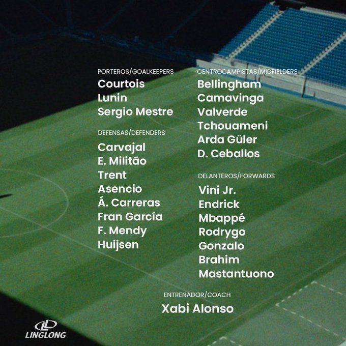 خط الهجوم:فينيسيوس جونيور – إندريك – كيليان مبابي – رودريجو – جونزالو – براهيم دياز – فرانكو ماستانتونو