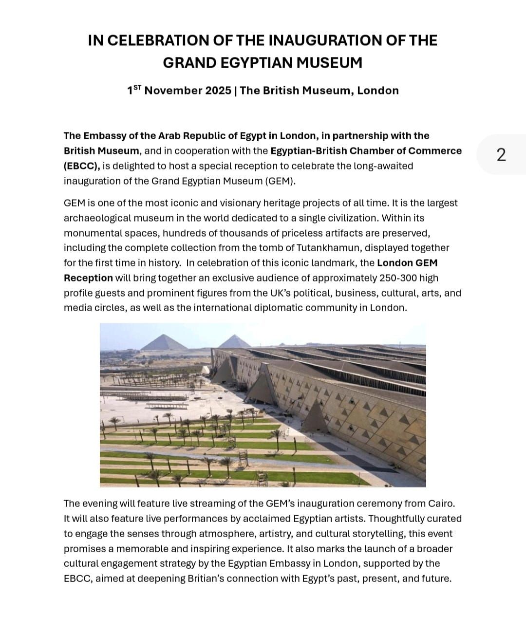 تقيم سفارةُ جمهورية مصر العربية في لندن في الأول من نوفمبر الجاري حفل استقبال رسمي في المتحف البريطاني احتفالًا بالافتتاح التاريخي للمتحف المصري الكبير، وذلك بحضور ومشاركة واسعة من كبار المسئولين من الحكومة البريطانية، ومجلسي العموم واللوردات، والقصر الملكي، ورجال الأعمال البريطانيين والمصريين، إلى جانب نخبة من الشخصيات الثقافية والإعلامية، والفنانين، والخبراء في الآثار المصرية، وعدد من المؤثرين والمهتمين بالشأن المصري من كبار الشخصيات الحكومية والدبلوماسية والسياسية والثقافية والإعلامية في المملكة المتحدة، وأصدقاء مصر ومحبي حضارتها العريقة.