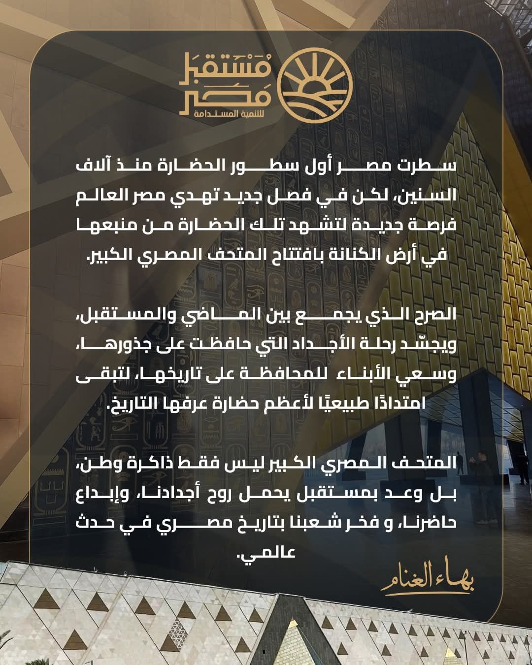في منشور عبر الصفحة الرسمية لجهاز مستقبل مصر للتنمية المستدامة، وجه الدكتور بهاء الغنام رئيس الجهاز رسالة للشعب المصري والعالم بمناسبة افتتاح المتحف المصري.