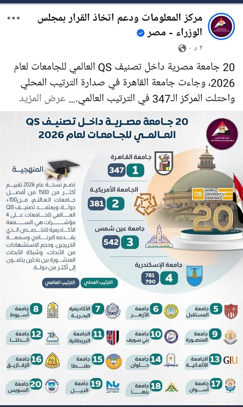 أعلن مركز المعلومات ودعم اتخاذ القرار بمجلس الوزراء، دخول 20 جامعة مصرية ضمن تصنيف QS العالمي للجامعات لعام 2026، في إنجاز جديد يعكس التطور المستمر في منظومة التعليم العالي والبحث العلمي في مصر.