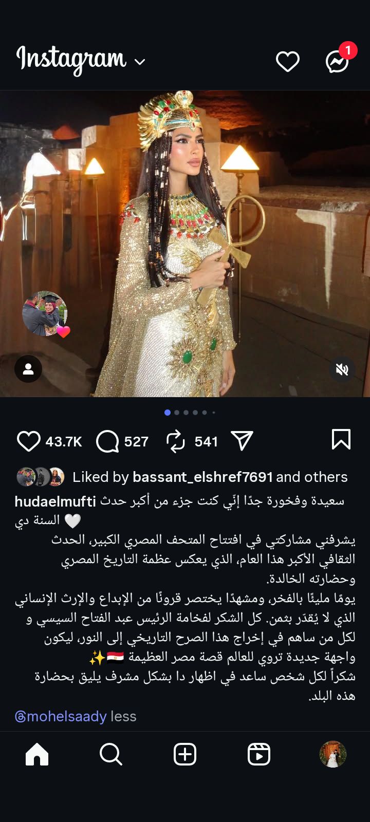 وكتبت هدى المفتي في منشور رصده موقع تحيا مصر على حسابها الرسمي بموقع تبادل الصور والفيديوهات انستجرام: فخورة جدًا إني كنت جزء من أكبر حدث السنة دي.. يشرفني مشاركتي في افتتاح المتحف المصري الكبير الحدث الثقافي الأكبر هذا العام، الذي يعكس عظمة التاريخ المصري وحضارته الخالدة.