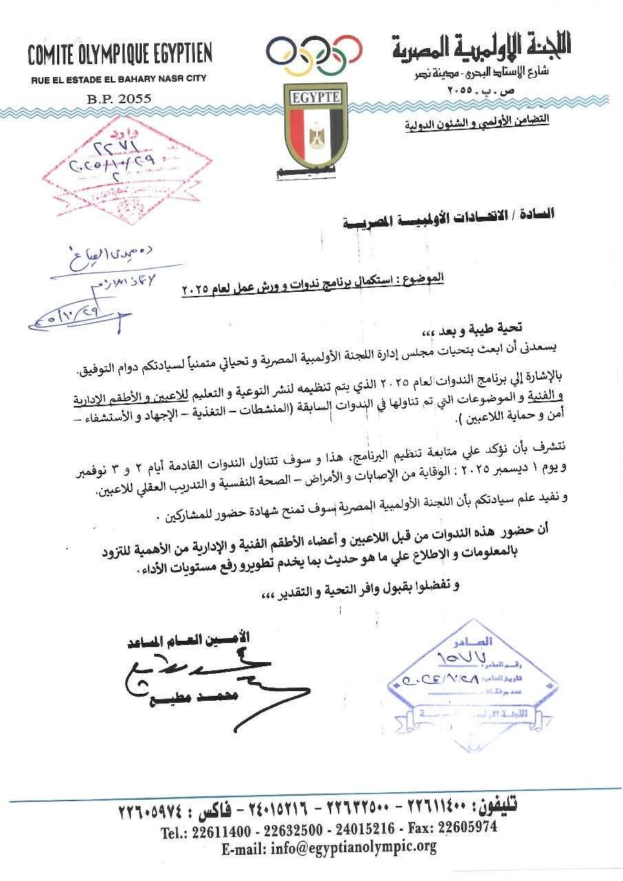 أعلنت اللجنة الأولمبية المصرية استكمال برنامج الندوات وورش العمل لعام 2025، في إطار خطتها المستمرة لنشر الوعي والتثقيف الرياضي بين اللاعبين والأطقم الفنية والإدارية، وحرصها على تطوير المعرفة في مجالات الطب الرياضي والصحة النفسية والتدريب العقلي، وذلك استكمالا لسلسلة الندوات التي تناولت خلال العام موضوعات هامة مثل المنشطات، والتغذية، والإجهاد والاستشفاء، وأمن وحماية اللاعبين.