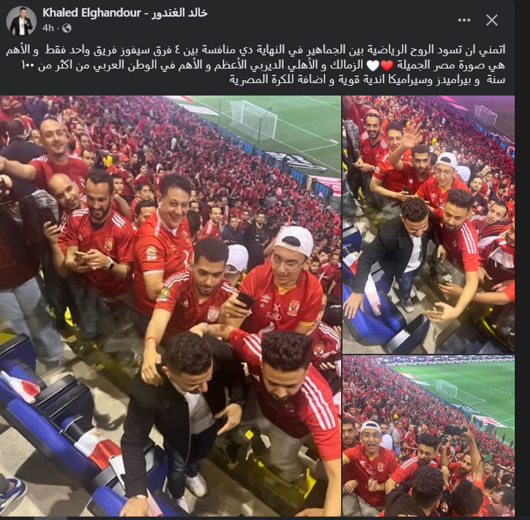 تحيا مصر، وكتب خالد الغندور عبر حسابه الرسمي"فيس بوك": أتمني أن تسود الروح الرياضية بين الجماهير في النهاية دي منافسة بين ٤ فرق سيفوز فريق واحد فقط".