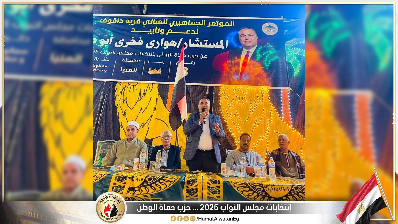 نظم حزب حماة الوطن بالمنيا لقاءاً جماهيرياً، بقرية داقوف بمركز سمالوط، دعماً لمرشحه هواري فخري أبو طهير، المرشح على المقاعد الفردية، وذلك تزامناً مع انطلاق فترة الدعاية الانتخابية، وذلك في إطار الاستعدادات المكثفة لانتخابات مجلس النواب 2025.