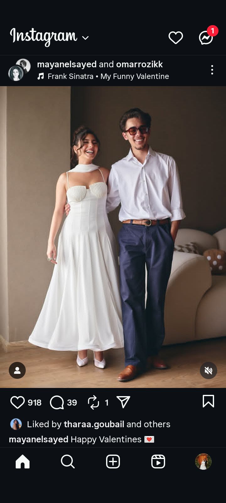 وظهرت مايان السيد في الصورة التي رصدها موقع تحيا مصر على حساب الفنانة بموقع تبادل الصور والفيديوهات انستجرام، مرتدية فستان أبيض، بينما عمر رزيق فظهر ببنطلون أزرق وقميص أبيض، وعلقت عليها بجملة "happy Valentine's".