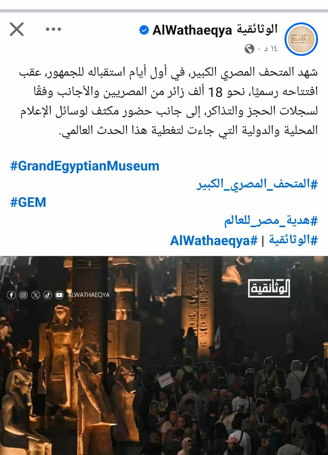 شهد المتحف المصري الكبير، في أول أيام استقباله للجمهور، إقبالا جماهريا كبيراعقب افتتاحه رسميًّا، بلغ نحو 18 ألف زائر من المصريين والأجانب وفقًا لسجلات الحجز والتذاكر، إلى جانب حضور مكثف لوسائل الإعلام المحلية والدولية التي جاءت لتغطية هذا الحدث العالمي كما أعلنت القناة أيضًا عن إعادة الفيلم الوثائقي "المتحف المصري الكبير.. قصة البناء" في تمام الساعة العاشرة مساء اليوم الأربعاء.