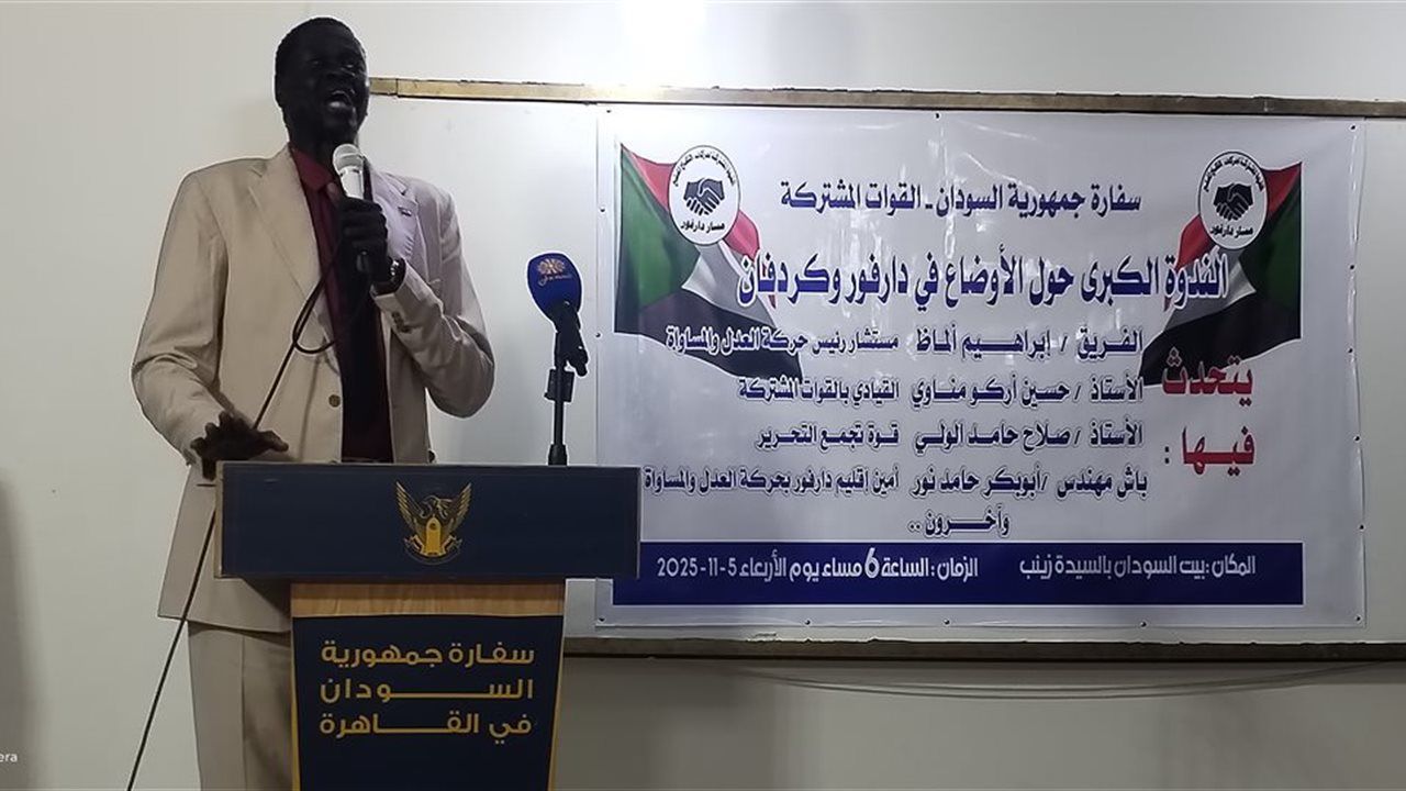 وخلال الندوة، تحدث الفريق إبراهيم الماظ، مستشار رئيس حركة العدل والمساواة، مستعرضًا جذور الأزمة الراهنة في دارفور وتداعياتها على النسيج الاجتماعي، مؤكدًا أن المرحلة تتطلب توحيد الرؤى بين القوى السياسية والميدانية من أجل وضع حد لحالة الانقسام وتغليب مصلحة الوطن على أي حسابات ضيقة. وأوضح أن الحل لن يكون عسكريًا، بل سياسيًا يراعي مشاركة كافة المكونات بما فيها الشباب والنساء والمجتمعات المحلية المتضررة من النزاع.