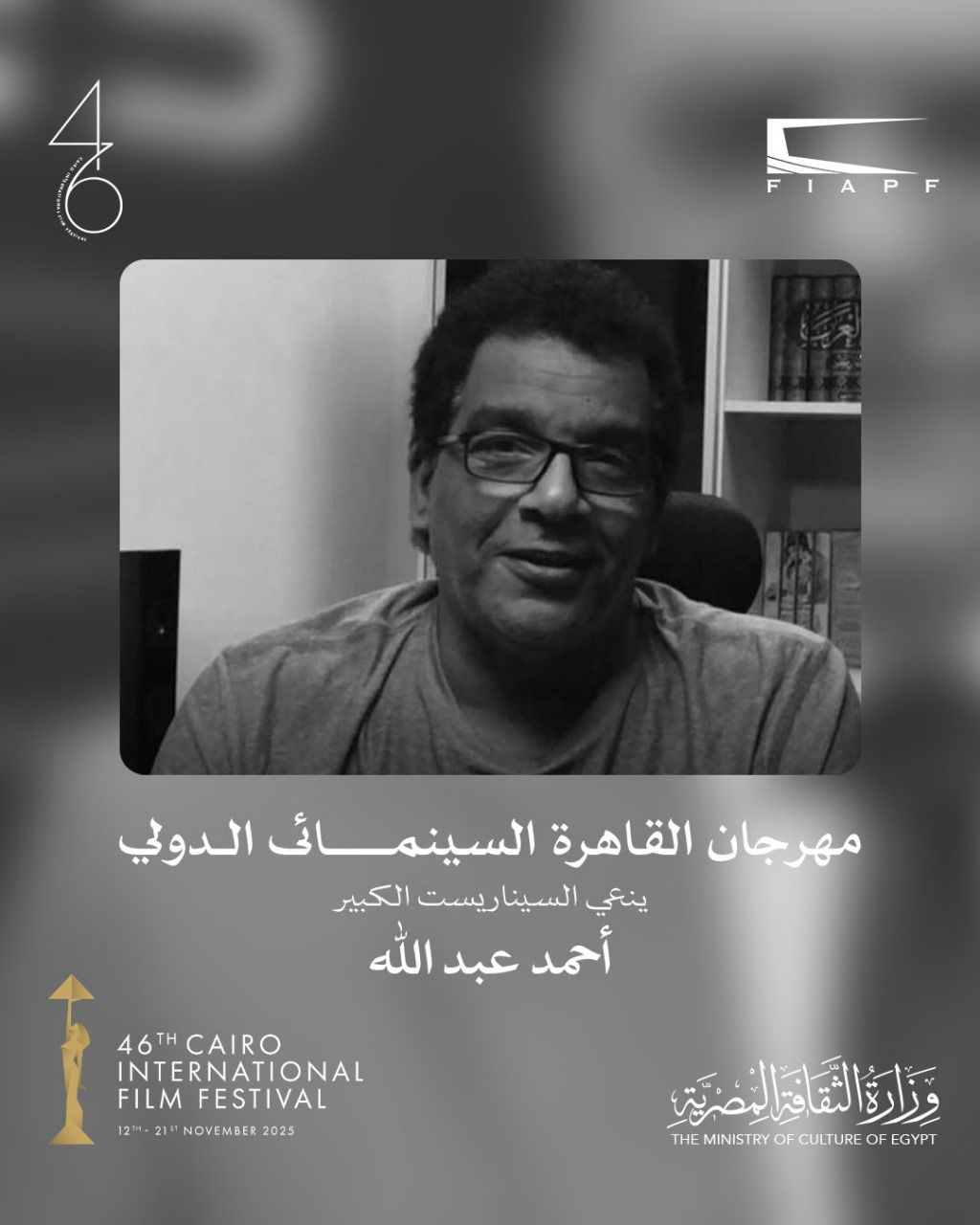 نعى مهرجان القاهرة السينمائي الدولي، برئاسة الفنان حسين فهمي، السيناريست الكبير أحمد عبد الله، الذي وافته المنية بعد مسيرة فنية مؤثرة، أثرى خلالها السينما المصرية بالكثير من الأعمال البارزة.