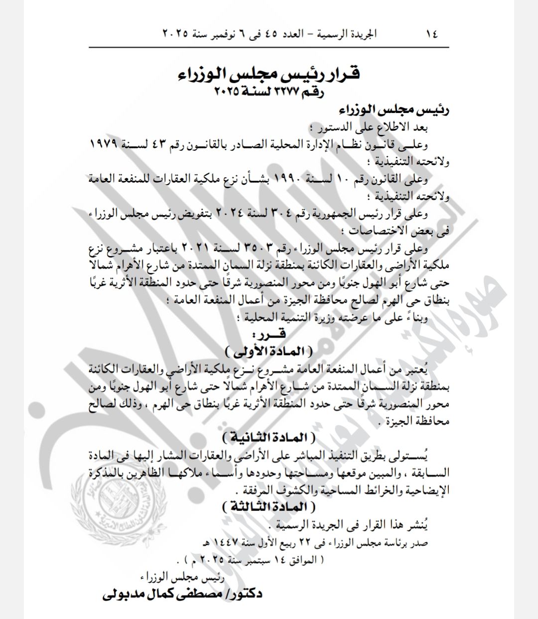 قرار نزع ملكية أراضي وعقارات في الجيزة .. أصدر الدكتور مصطفى مدبولي، رئيس مجلس الوزراء، قرارًا رسميًا يقضي باعتبار مشروع نزع ملكية الأراضي والعقارات بمنطقة نزلة السمان في نطاق حي الهرم بمحافظة الجيزة، من أعمال المنفعة العامة، وذلك في إطار خطة الدولة لتطوير المناطق الحيوية وتحسين مستوى الخدمات العامة للمواطنين.