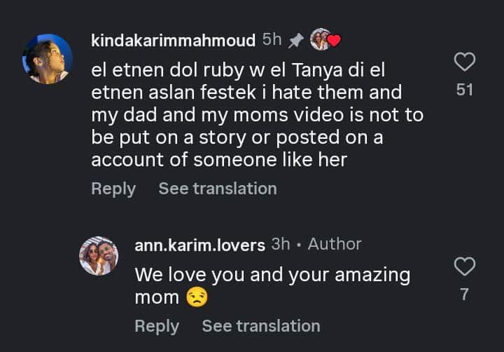 وكتبت ابنة كريم محمود عبد العزيز في منشور رصده موقع تحيا مصر على حسابها الرسمي بموقع تبادل الصور والفيديوهات انستجرام: الاتنين دول فيستك وأنا بكرههم ومينفعش بابا أو ماما يتجاب سيرتهم في بوستات ليها علاقة بيهم.