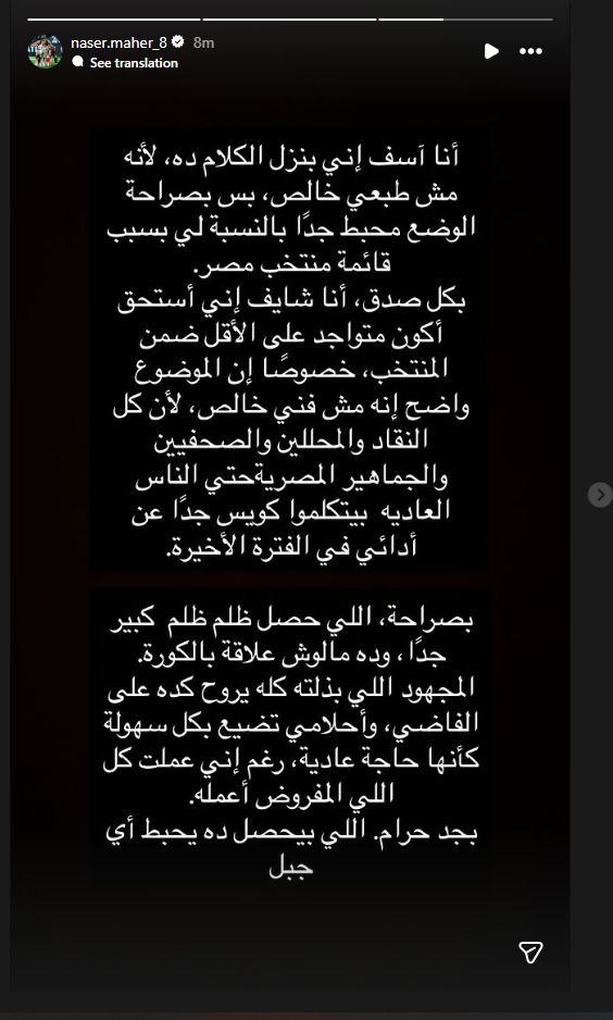 وكتب ناصر ماهر عبر حسابه الرسمي" انستجرام":أنا أسف إني بنزل الكلام ده لأنه مش طبي خالص بس بصراحة الوشع محبط جداً بالنسبة ليا بسبب قائمة منتخب مصر".