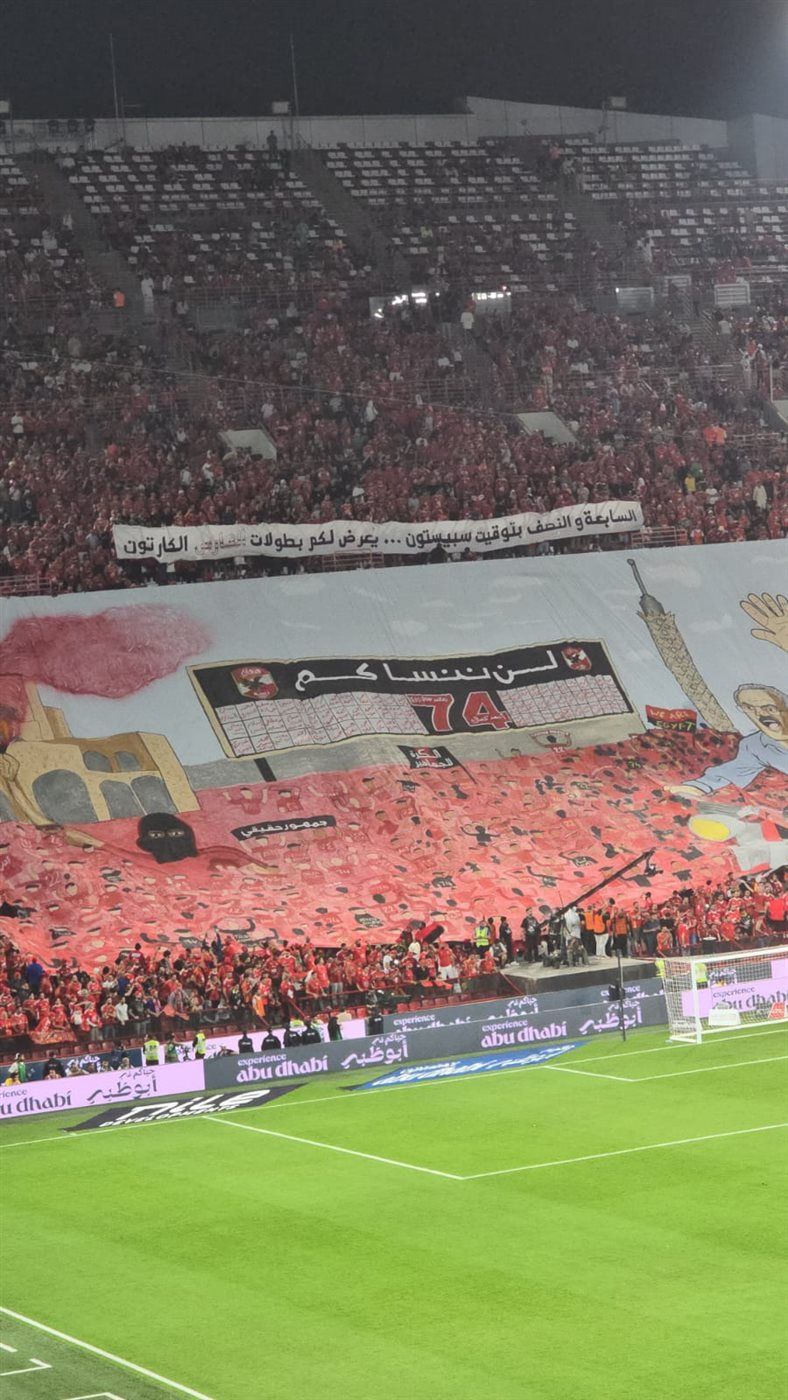 في المقابل نظم جمهور الأهلي دخلة تخلد شهداء الأهلي الـ74 ، وكتبت عليها : بشغفهم بدأت الحكاية.. وبتضحياتهم كُتب التاريخ.