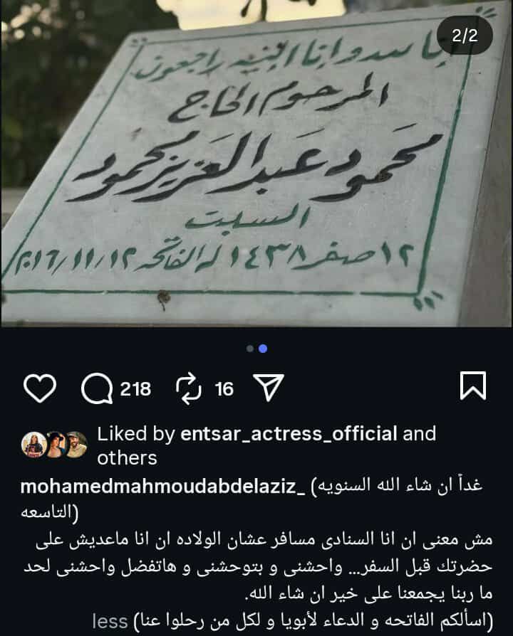 حرص محمد محمود عبد العزيز على إحياء ذكرى وفاة والده محمود عبد العزيز، وذلك من خلال زيارته في المقابر قبل سفره إلى الخارج، من أجل ولادة زوجته، وكتب له رسالة مؤثرة على حسابه الرسمي بموقع تبادل الصور والفيديوهات انستجرام، فكتب في منشور رصده موقع تحيا مصر: "غداً إن شاء الله الذكرى التاسعة، مش معنى إن أنا السنادي مسافر عشان الولادة إن أنا ماعديش على حضرتك قبل السفر.. واحشني وبتوحشني وهاتفضل واحشني لحد ماربنا يجمعنا على خير إن شاء الله.