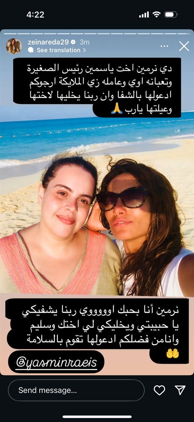 وشاركت الفنانة زينة، جمهورها ومتابعيها، وفقا لما رصده موقع تحيا مصر، صورة لـ شقيقة ياسمين رئيس، عبر حسابها الشخصي بموقع انستجرام، وعلقت عليها: دي نرمين أخت ياسمين رئيس، تعبانة أوي، عاملة زي الملايكة، أرجوكم ادعولها بالشفاء، ربنا يخليها لأختها وعيلتها، نرمين انا بحبك اوي، ربنا يشفيكي ويعفيكي، ويخليكي لأختك وسليم وانا، ادعولها تقوم بالسلامة.