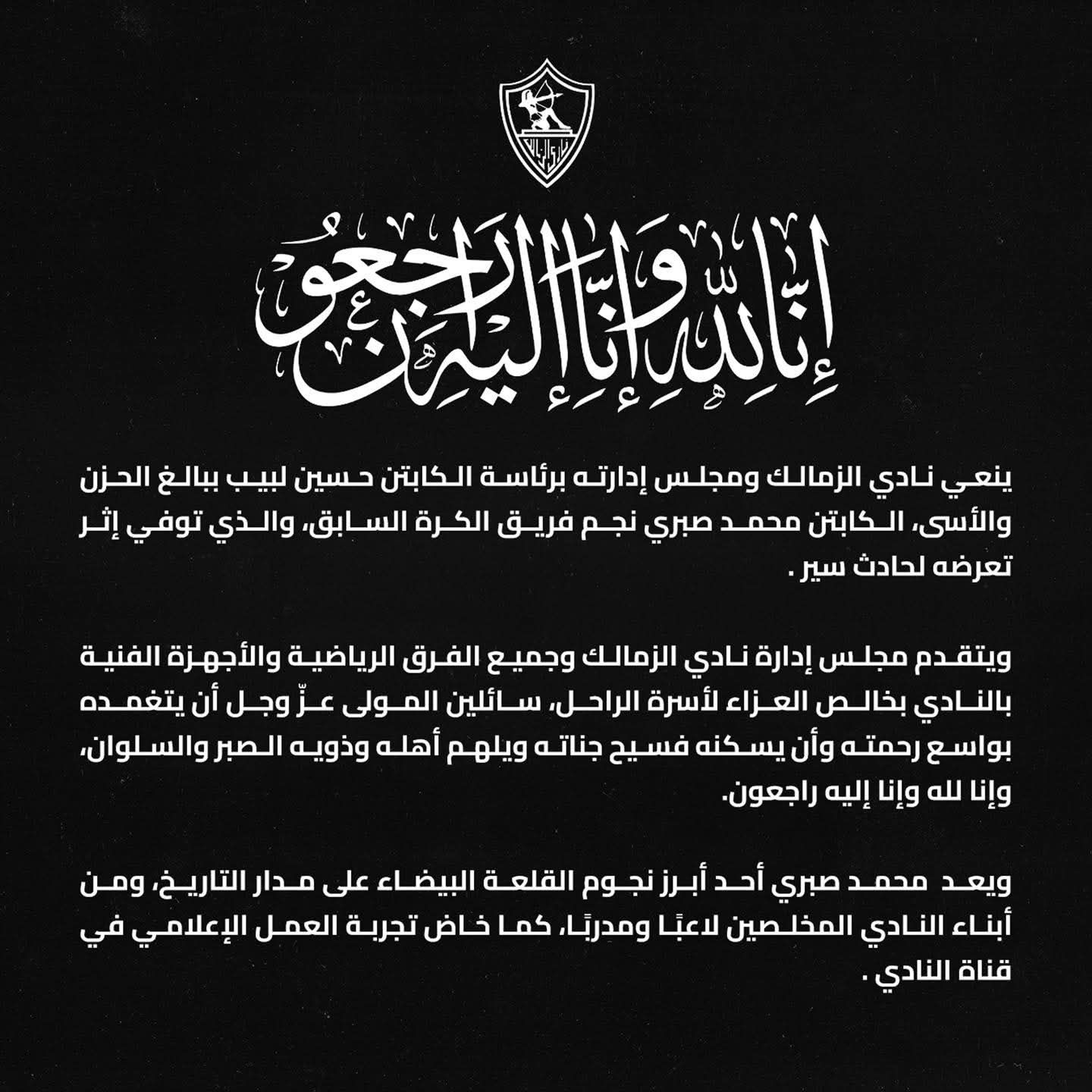 ونشرت الصفحة الرسمية للنادي على فيسبوك بيانًا جاء فيه: «إنا لله وإنا إليه راجعون.. ينعي نادي الزمالك ومجلس إدارته برئاسة الكابتن حسين لبيب، الكابتن محمد صبري نجم الفريق السابق، والذي توفي إثر تعرضه لحادث سير».