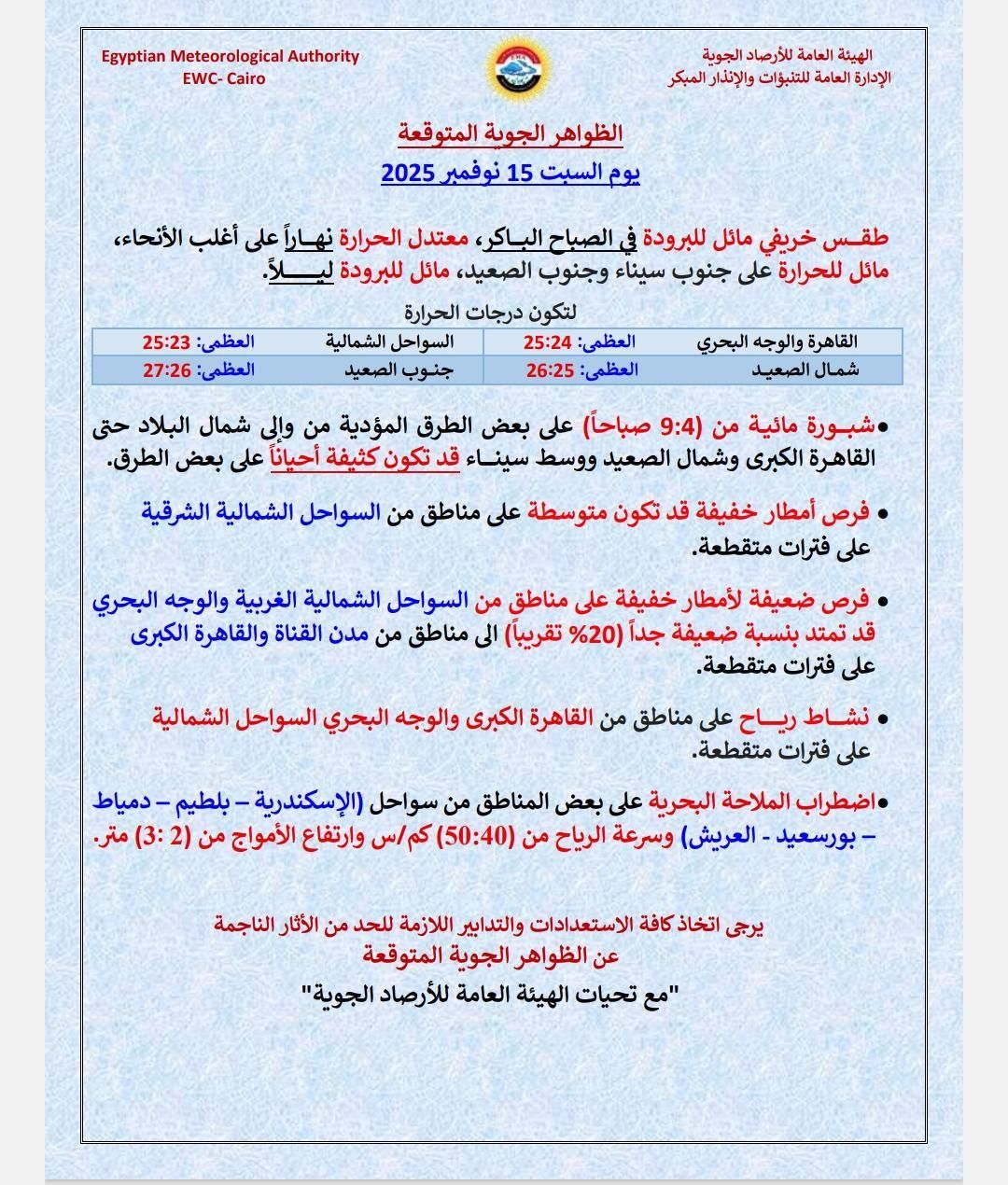 أعلنت الهيئة العامة للأرصاد الجوية توقعاتها بشأن حالة الطقس غدا السبت 15 نوفمبر 2025، مؤكدة أن البلاد ستشهد حالة من عدم الاستقرار على بعض المناطق، مع فرص لسقوط الأمطار ونشاط للرياح واضطراب في حركة الملاحة البحرية.