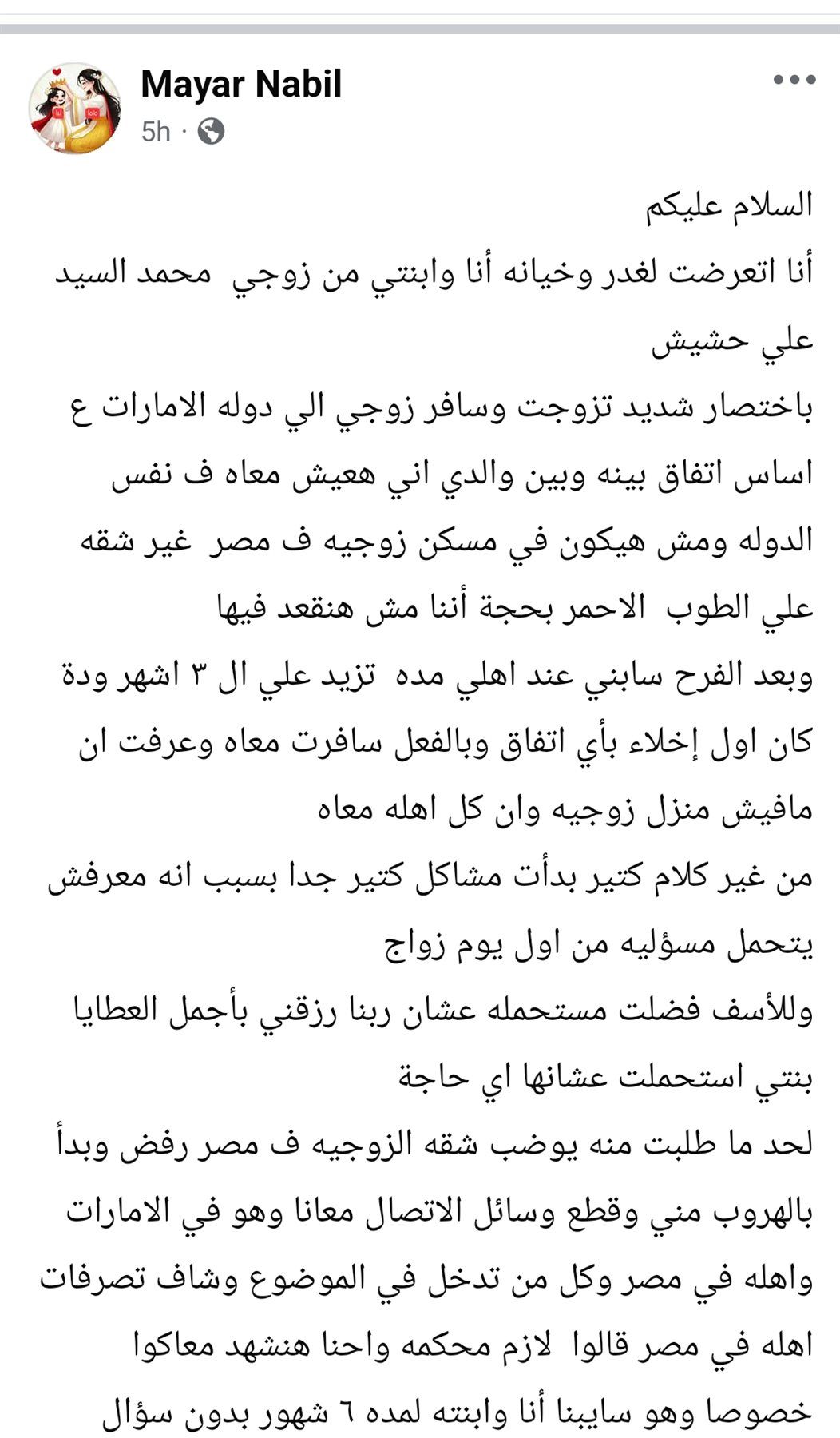 وتشير إلى أنها طلبت منه تجهيز شقة الزوجية في مصر لكنه رفض، ثم بدأ في الهروب وإغلاق وسائل التواصل لمدة ستة أشهر كاملة "دون أن يسأل عنها أو عن طفلته".