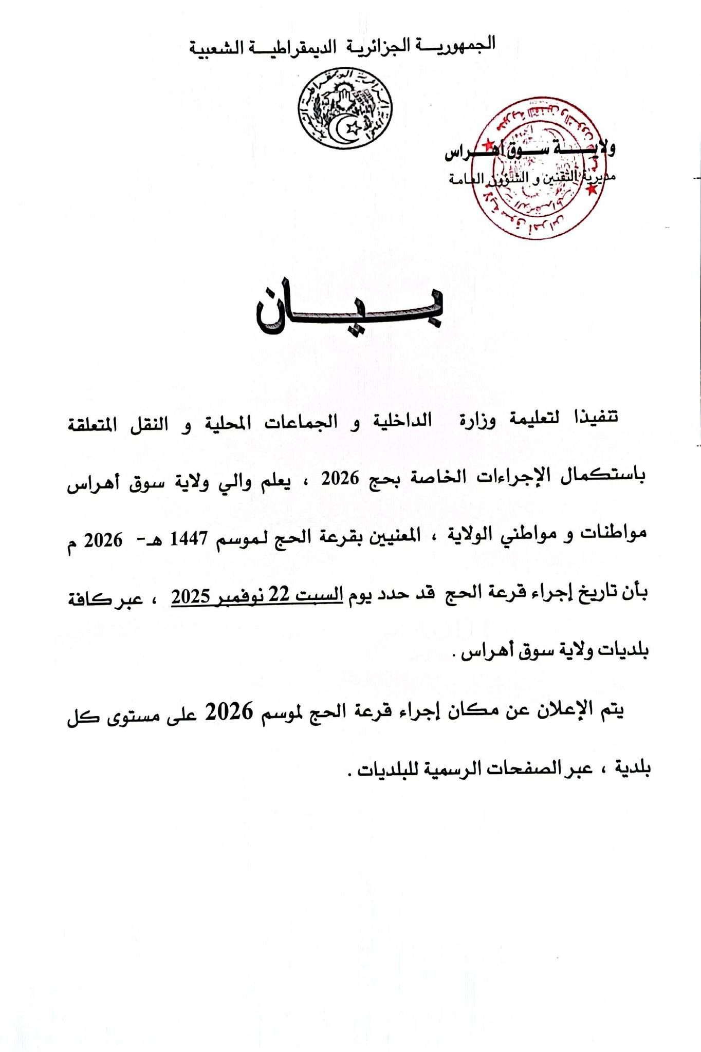 وكشفت مصالح ولاية سوق أهراس، أنه "تنفيذا لتعليمة وزارة الداخلية والجماعات المحلية والنقل المتعلقة باستكمال الإجراءات الخاصة بحج 2026، فإن والي ولاية سوق أهراس يعلن لكافة مواطنات ومواطني الولاية، المعنيين بقرعة الحج لموسم 1447 هـ – 2026 م، بأن تاريخ إجراء قرعة الحج قد حدد يوم السبت 22 نوفمبر 2025 بلديات ولاية سوق أهراس" .