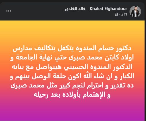 وكتب خالد الغندور على فيسبوك، إن الدكتور المندوه الحسيني سيتولى كذلك التواصل مع بنات الراحل الكبار لتقديم الدعم اللازم لهن، مشيرًا إلى أنه سيلعب دور حلقة الوصل بين الطرفين لضمان وصول المساعدة بالشكل الأمثل.