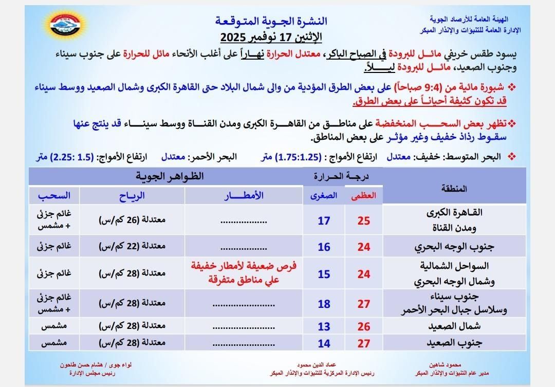 كشفت الهيئة العامة للأرصاد الجوية تفاصيل حالة الطقس اليوم الإثنين 17 نوفمبر 2025، حيث يسود طقس خريفي مائل للبرودة في الصباح الباكر، معتدل الحرارة نهارًا على أغلب الأنحاء، مائل للحرارة على جنوب سيناء وجنوب الصعيد، مائل للبرودة ليلًا.