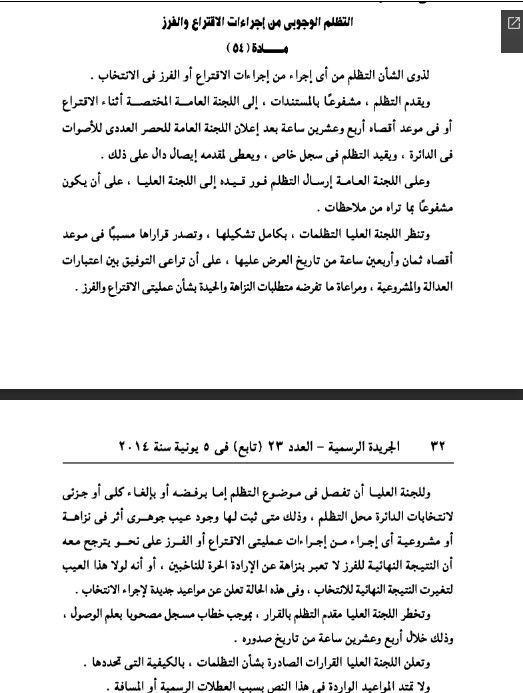 تنص المادة (54) من القانون على حق ذوي الشأن — سواء مرشحين أو وكلائهم أو الناخبين — في التظلم من أي إجراء متعلق بالاقتراع أو الفرز داخل لجان الانتخابات، ويتم تقديم التظلم إلى اللجنة العامة المختصة خلال أحد موعدين: