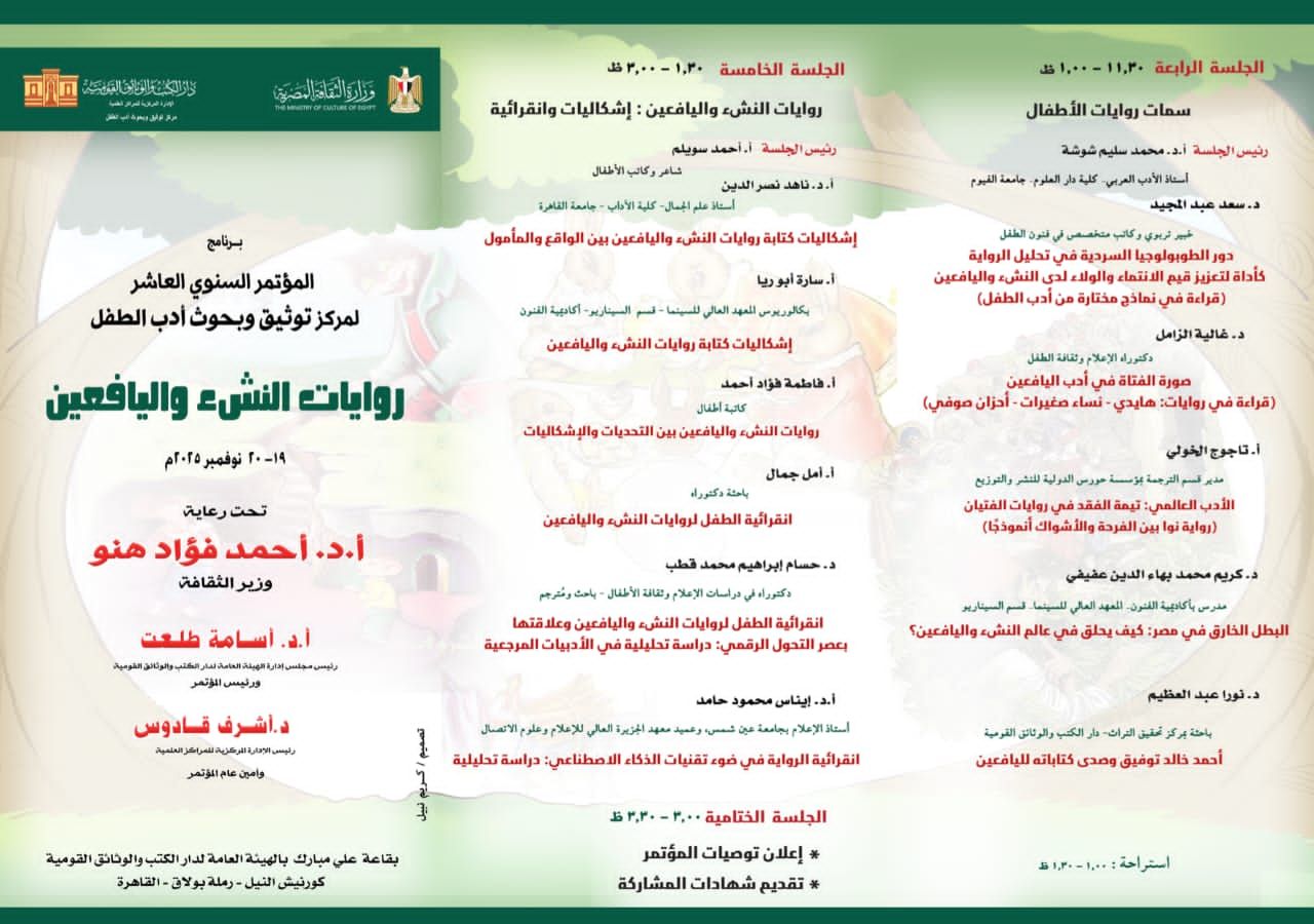 تنظم الهيئة العامة لدار الكتب والوثائق القومية برئاسة الدكتور أسامة طلعت، وأمانة الدكتور أشرف قادوس، رئيس الإدارة المركزية للمراكز العلمية، المؤتمر السنوي العاشر لمركز توثيق وبحوث أدب الطفل تحت عنوان: "روايات النشء واليافعين"، وذلك يومي 19 و20 نوفمبر 2025 بقاعة علي مبارك بمقر الهيئة على كورنيش نيل رملة بولاق بالقاهرة.