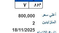 - لوحة تحمل رقم "م وو– 7"، ووصل سعرها حتى الآن إلى 800.000 ألف جنيه، وتنتهي المزايدة عليها 18نوفمبر2025.