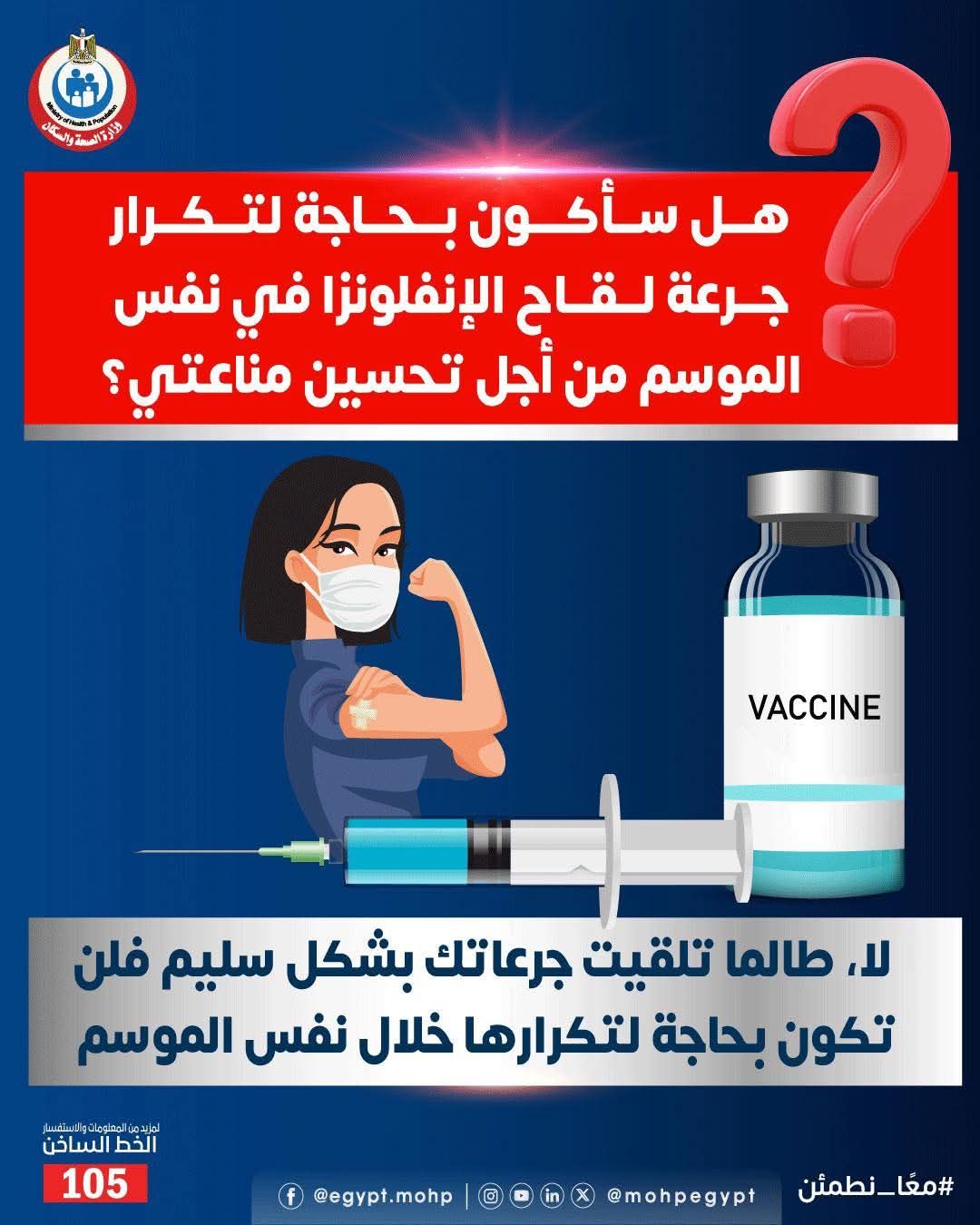 وحول التساؤلات بشأن الحصول على لقاح الإنفلونزا مرة أخرى فى نفس الموسم، أكد أن المواطن لا يحتاج إلى تكرار الجرعة داخل نفس الموسم طالما تلقى التطعيم وفق الضوابط المعتمدة من الوزارة ومنظمة الصحة العالمية.