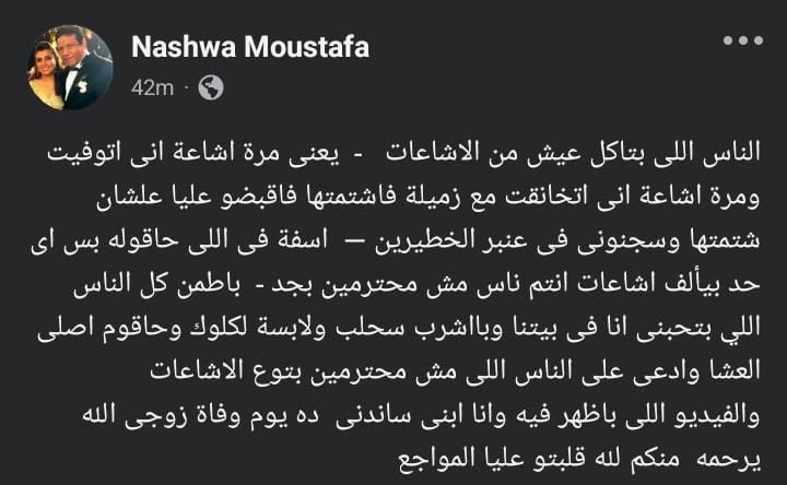 وكتبت الفنانة نشوى مصطفى منشورا، ترد من خلاله على مروجي شائعات وفاتها، وفقا لما رصده موقع تحيا مصر، وذلك عبر صفحتها الشخصية على موقع التواصل الاجتماعي فيسبوك، قالت فيه: الناس اللى بتاكل عيش من الاشاعات، يعنى مرة إشاعة انى اتوفيت ومرة إشاعة انى اتخانقت مع زميلة، فاشتمتها فاقبضوعليا، علشان شتمتها وسجنونى فى عنبر الخطيرين.