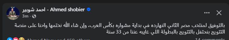 تحيا مصر، وكتب أحمد شوبير عبر حسابه الرسمي"فيس بوك": بالتوفيق لمنتخب مصر الثاني النهارده في بداية مشواره بكأس العرب وإن شاء الله نختمها واحنا على منصة التتويج بنحتفل بالتتويج بالبطولة اللي غايبه عننا من 33 سنة".