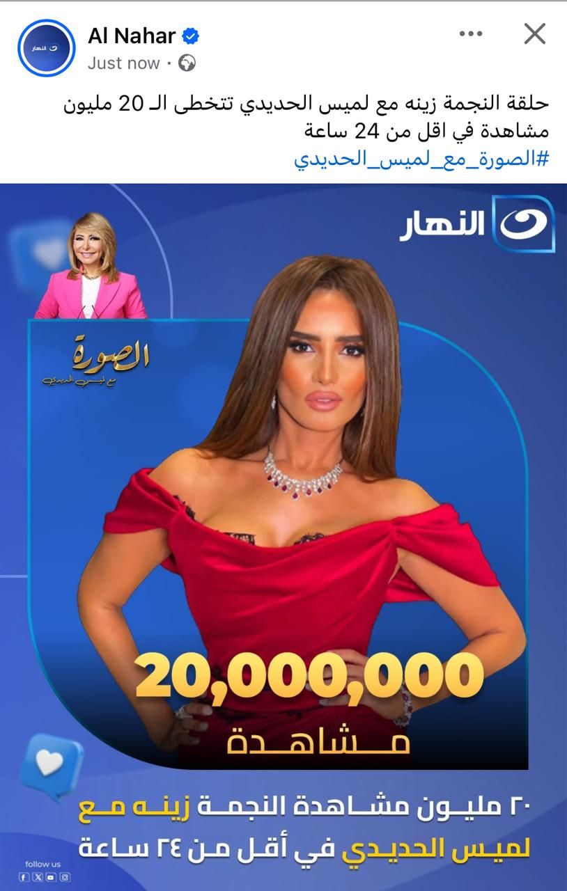 حققت حلقة النجمة زينة مع الإعلامية لميس الحديدي في برنامج الصورة على قناة النهار انتشاراً واسعاً عبر منصات التواصل الاجتماعي، حيث تصدرت الترند خلال الساعات الماضية، ووصلت مشاهدات مقاطع الحلقة على السوشيال ميديا إلى نحو 20 مليون مشاهدة خلال أقل من 24 ساعة من إذاعتها، بفضل التصريحات التي لاقت تفاعلاً كبيراً.