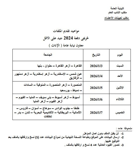 - وذلك وفقًا للميعاد المحدد لكل جامعة بالجدول المرفق بالملف وبعد تسجيل المتقدم البيانات الكترونيًا وفقًا للرقم السرى المرفق بالملف على موقع النيابة العامة www.ppo.gov.eg ولن يقبل الملف بدون أصل المؤهل.