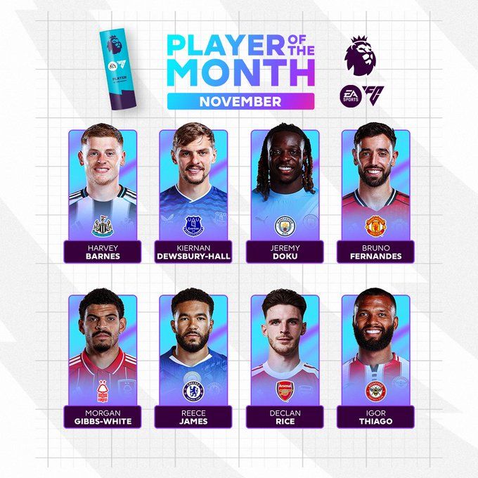 وسيشهد نوفمبر وجهًا جديدًا لجائزة الأفضل خلال هذا الموسم، بعد تتويج جاك جريليش لاعب إيفرتون في أغسطس، وإيرلينج هالاند نجم مانشستر سيتي في سبتمبر، ثم بريان مبيومو مهاجم مانشستر سيتي في أكتوبر.