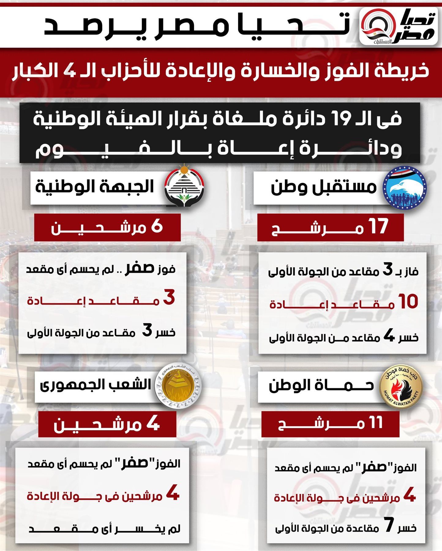 يقدم موقع تحيا مصر قراءة تحليلية شاملة لمسار الأحزاب الأربعة الأكبر تأثيرًا في منافسات الدوائر الـ19 التي أُعيدت بقرار من الهيئة الوطنية للانتخابات، بالإضافة إلى دائرة الإعادة في الفيوم، وذلك عبر رصد خريطة الفوز والخسارة ومواقع الإعادة لكل حزب، وما تعكسه من موازين قوة جديدة داخل المشهد البرلماني.