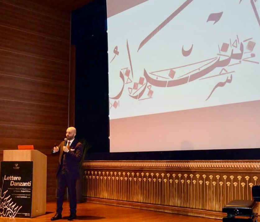 وألقى السفير بسام راضي سفير مصر في روما كلمة عبرت عن اهمية وتاريخ الخط العربى والاعتزاز به كجزء اصيل من الحضارة العربية والإسلامية وليشمل عدة عناصر من الفن الراقى تشمل إبداعات الخط العربى ومعانى الكلمات العميقة وكذلك الرسومات الفنية التى تتسم بدقة متناهية.