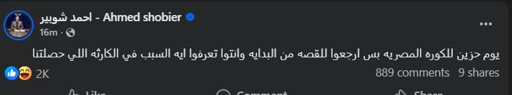 تحيا مصر، وكتب أحمد شوبير عبر حسابه الرسمي"فيس بوك": يوم حزين للكورة المصرية بس ارجعوا للقصة من البداية، وانتوا تعرفوا ايه السبب في الكارثة اللي حصلتنا".