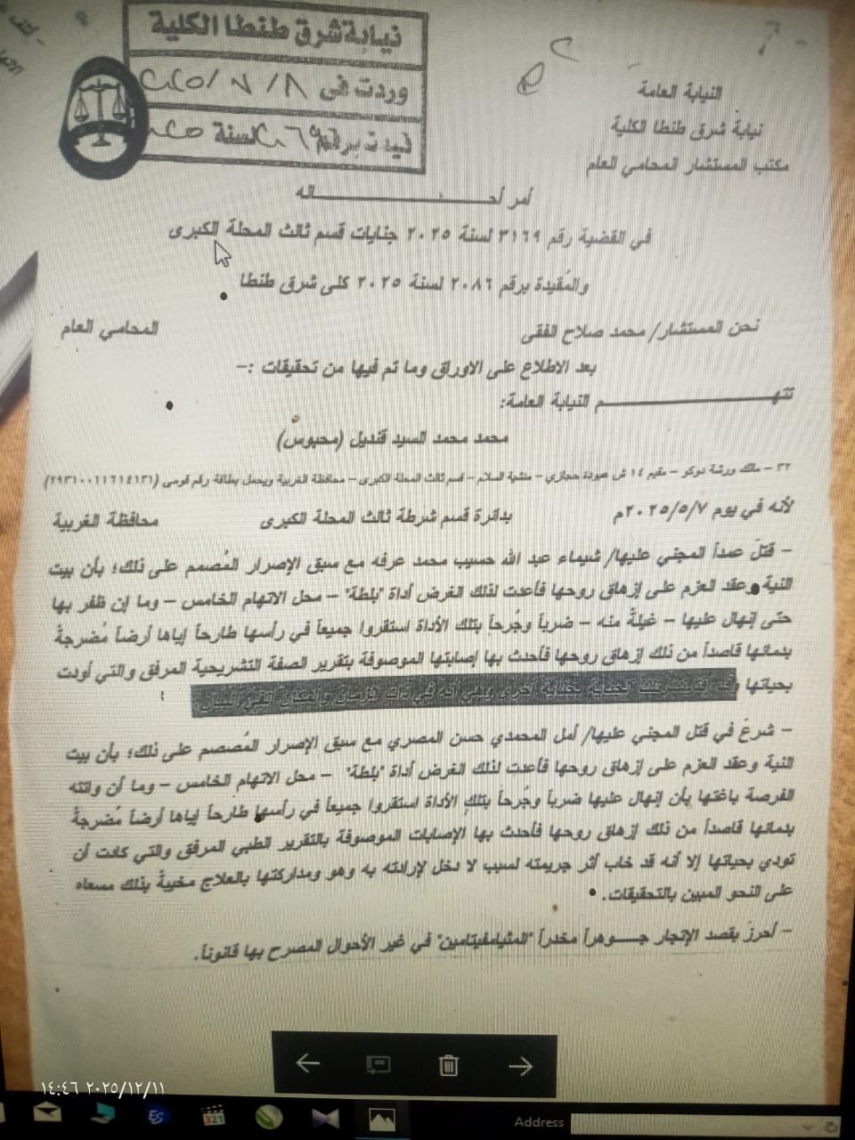 جنايات المحلة : متعاطى ' للشابو ' .. احالة اوراق الزوج المتهم بقتل زوجته واصابة والدته للمفتى