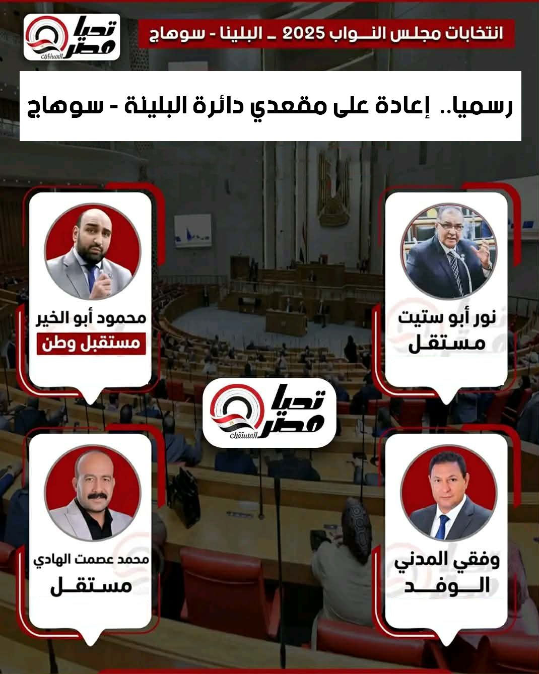 أعلنت الهيئة الوطنية للانتخابات، عن إعادة الانتخابات على مقعدي دائرة البلينا بمحافظة سوهاج، ضمن جولة الإعادة للمرحلة الثانية من انتخابات مجلس النواب 2025.
